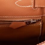 The interior is lined in gold chevre and has one zip pocket with Hermès engraved pull and two open pockets on the opposite side.