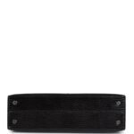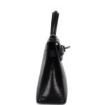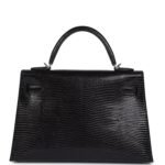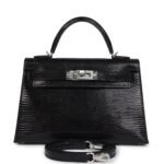 This Kelly, in the Sellier style, is in Black Varanus Niloticus lizard leather with palladium hardware and has tonal stitching, two straps with front toggle closure, single rolled handle and removable shoulder strap.