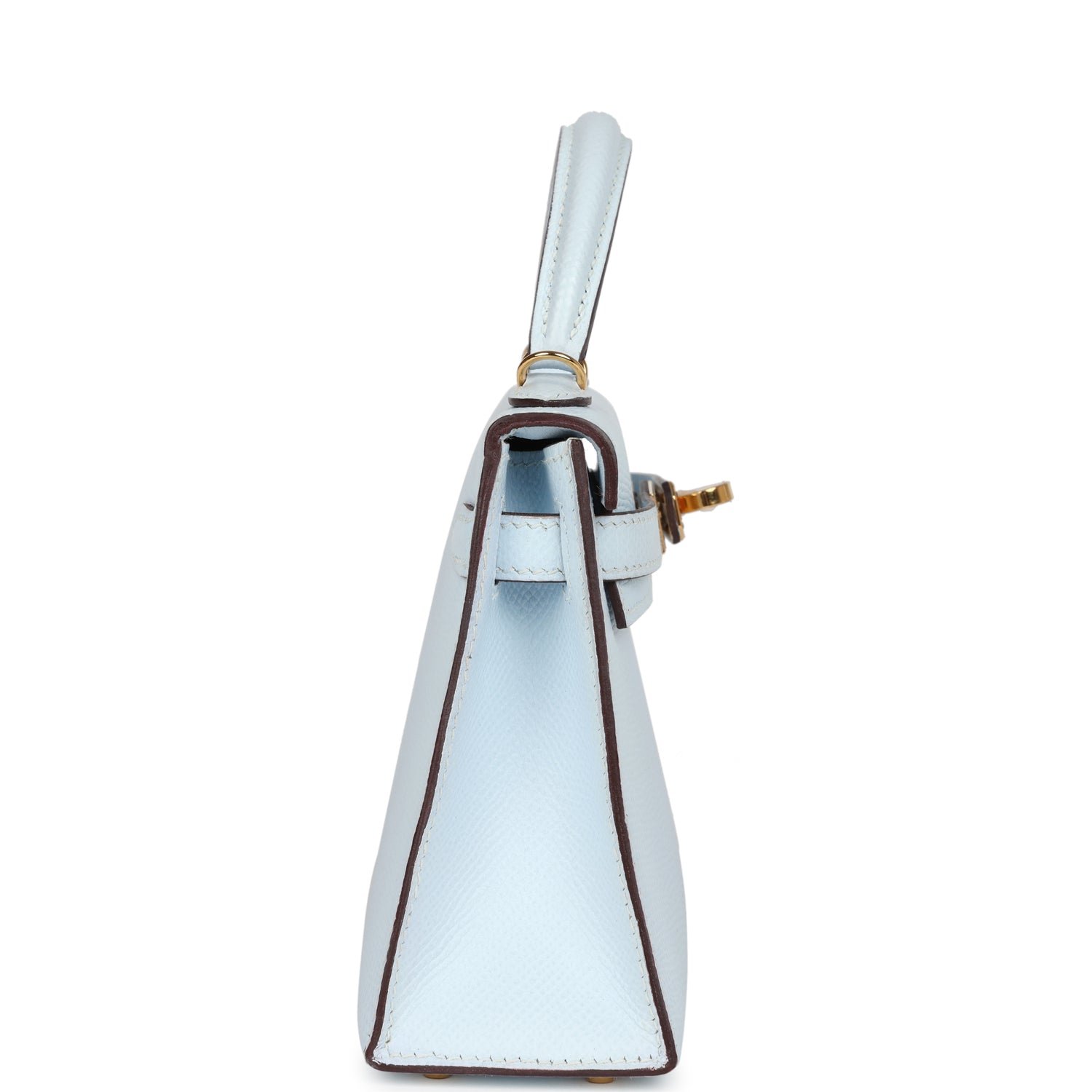 This Kelly, in the Sellier style, is inBleu Brume epsom leather with gold hardware andhas tonal stitching, two straps with front toggle closure, single rolled handle and removable shoulder strap.