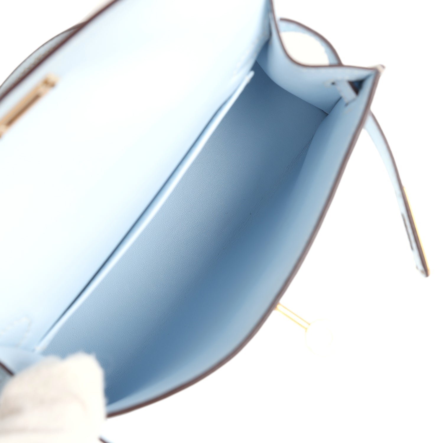 The interior is lined with Bleu Brume lambskin leather and has one open pocket on the back wall.