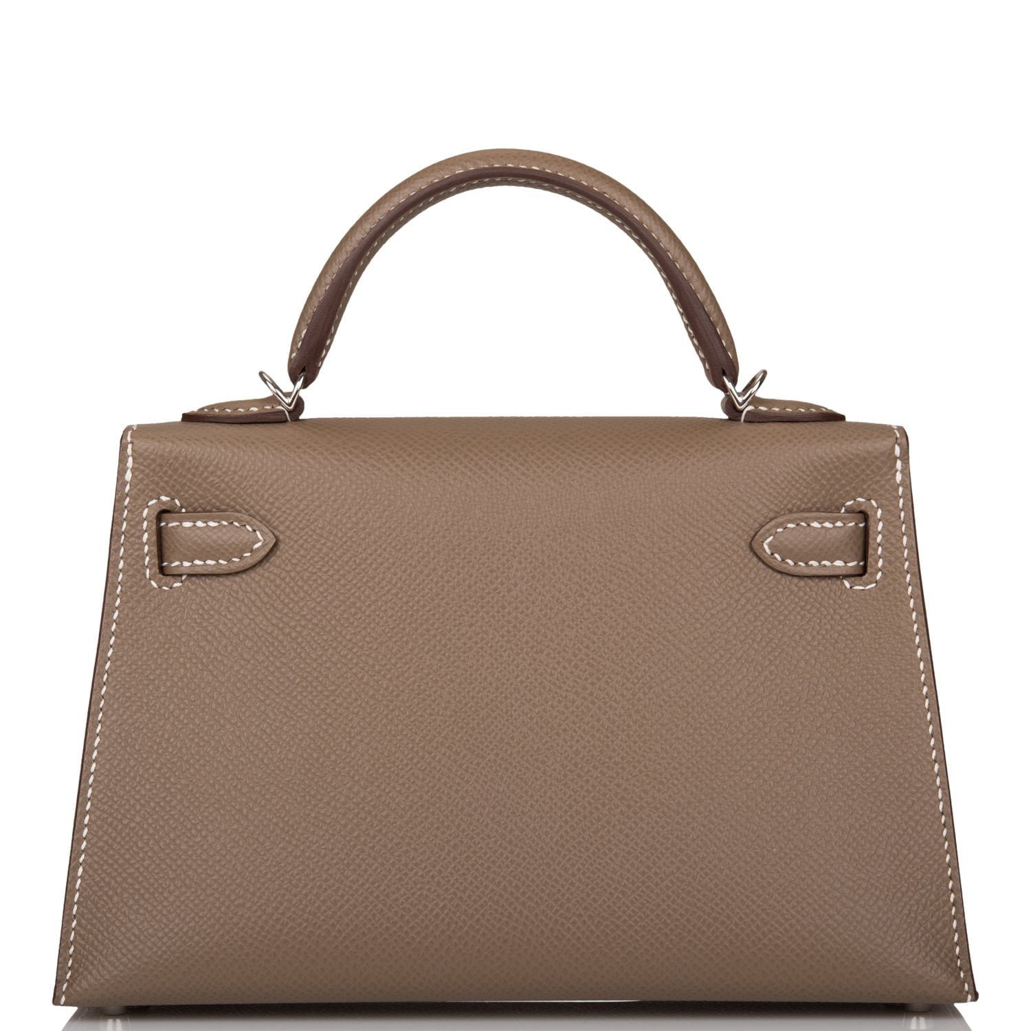 This Kelly, in the Sellier style, is inEtoupe epsom leather withpalladium hardware andhas contrast stitching, two straps with front toggle closure, single rolled handle and removable shoulder strap.