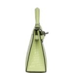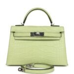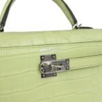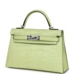 This tiny Kelly, in the Sellier style, is in Jaune Bourgeon matteMississippiensis alligator with palladium hardware andhastonal stitching, two front straps with front toggle closure, single rolled handle and removable shoulder strap.