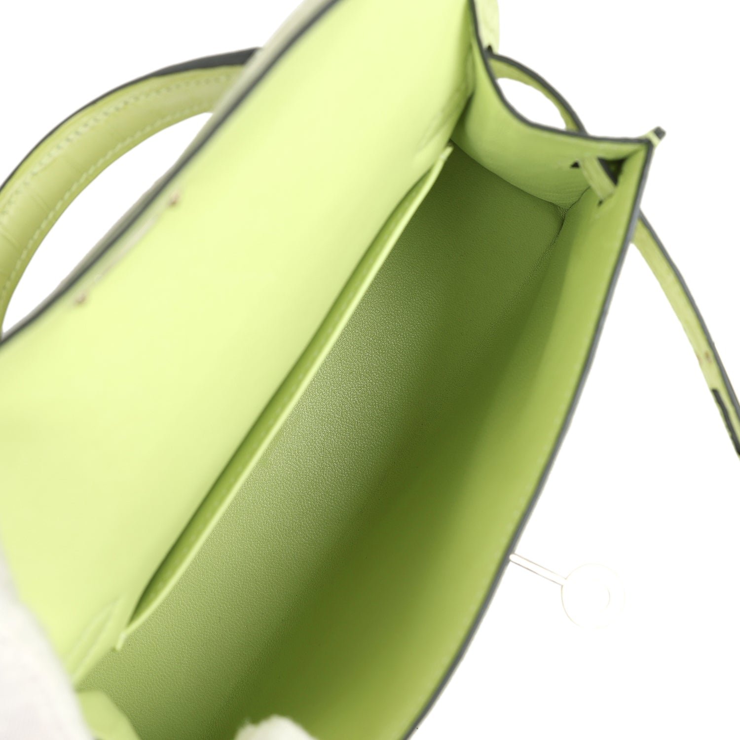 The interior is lined withJaune Bourgeonleather and has one open pocket on the back wall.