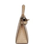 This mini Kelly is in Trench matte alligator mississippiensis withgold hardware andhastonal stitching, two front straps with front toggle closure, single rolled handle and removable shoulder strap.