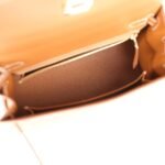 The interior is lined withgold chevre leather and has one zip pocket with an Hermès engraved pull and one open pocket on the opposite side.