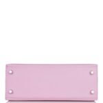 This Kelly, in the Sellier style, is inMauve Sylvestre epsom leather withpalladium hardware andhastonal stitching, two front straps with toggle closure, clochette with lock and two keys, single rolled handle and removable shoulder strap.