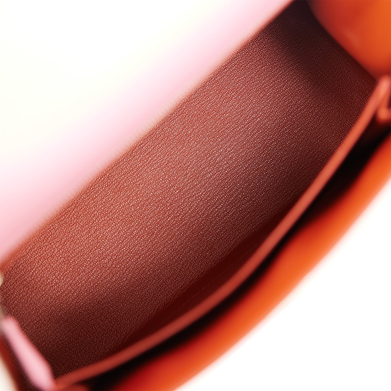 The interior is lined with Brique chevre leather and has one zip pocket with an Hermès engraved pull and one open pocket on the opposite side.