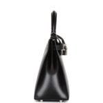 This Kelly Sellier is of black box calf leather withpalladium hardware and has tonal stitching, a front toggle closure, a clochette with lock and two keys, a single rolled handle and an optional shoulder strap.