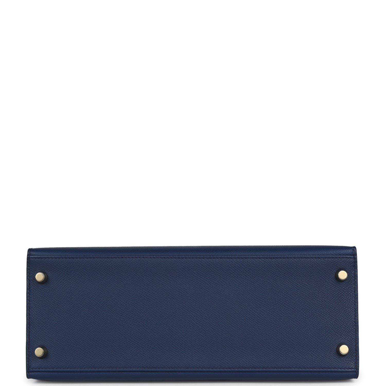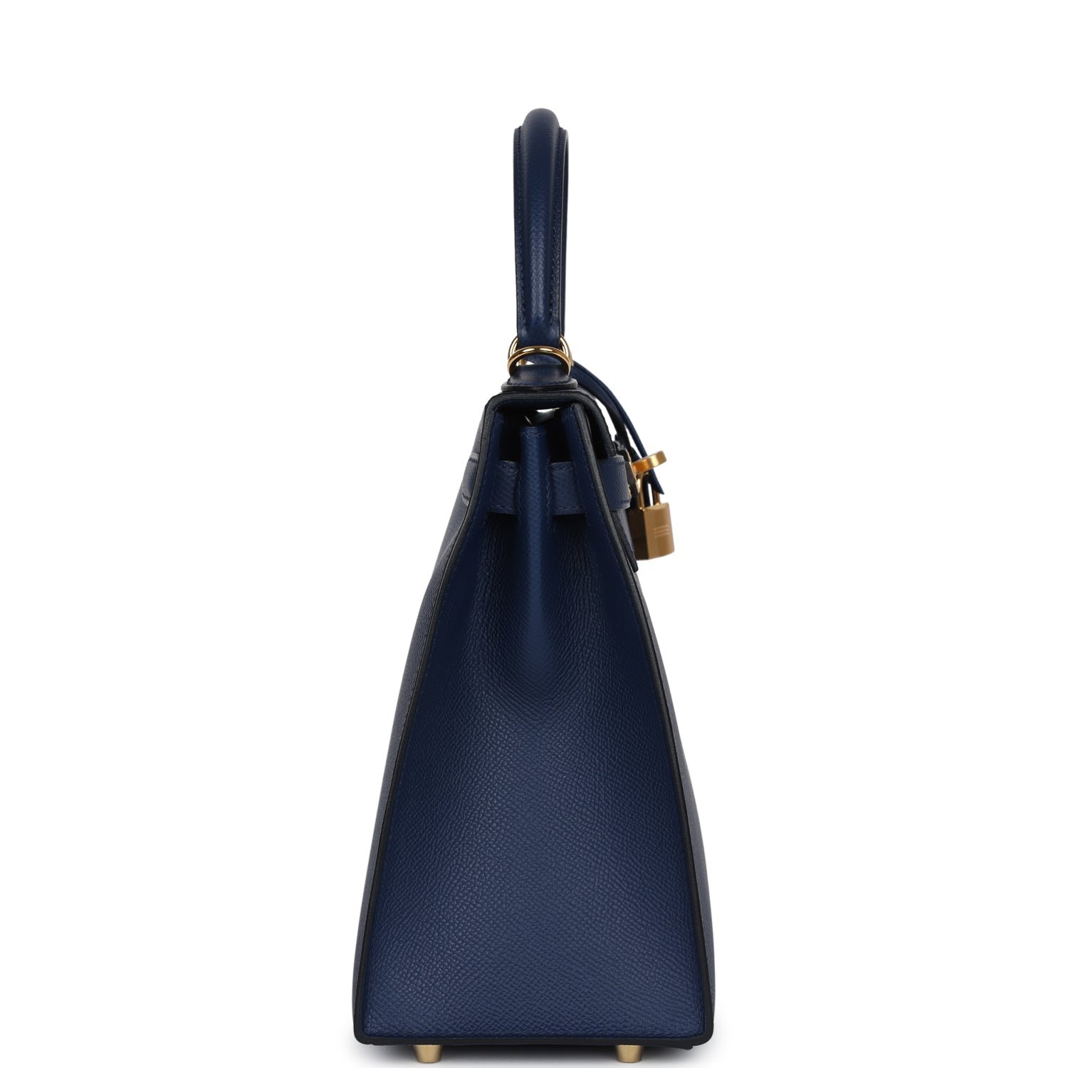 This Kelly, in the Sellier style, is in Bleu Navy epsom leather with gold hardware, has tonalstitching, front flap, two straps with center toggle closure, clochette with lock and two keys, singlerolled handle andremovableshoulder strap.