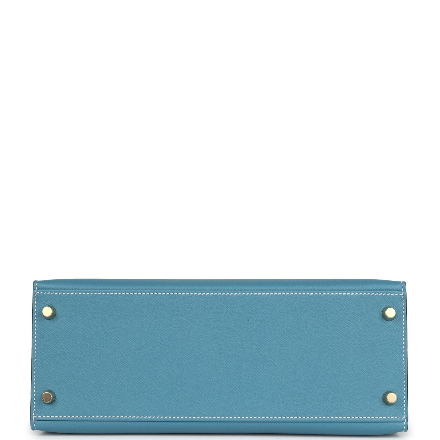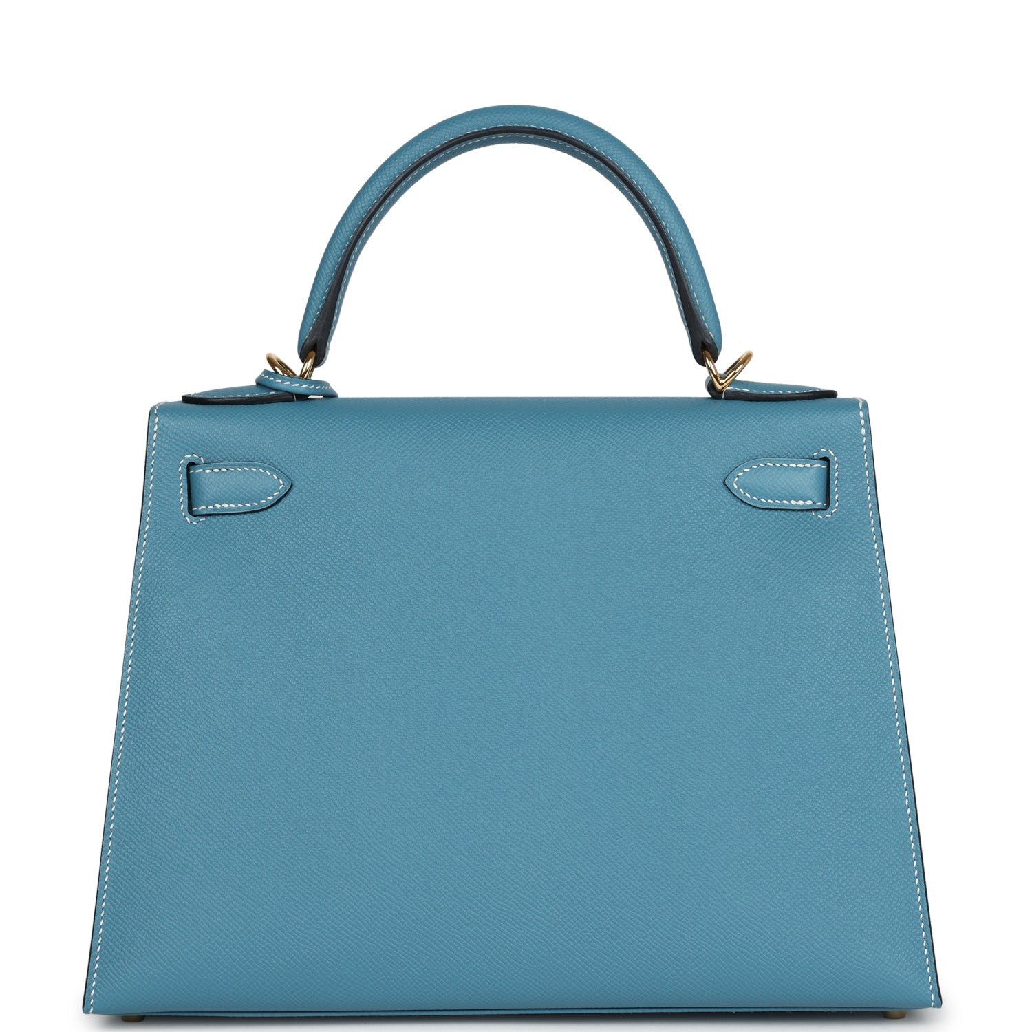 This Kelly, in the Sellier style, is in Blue Jean epsom leather with gold hardware, has contraststitching, front flap, two straps with center toggle closure, clochette with lock and two keys, singlerolled handle andremovableshoulder strap.
