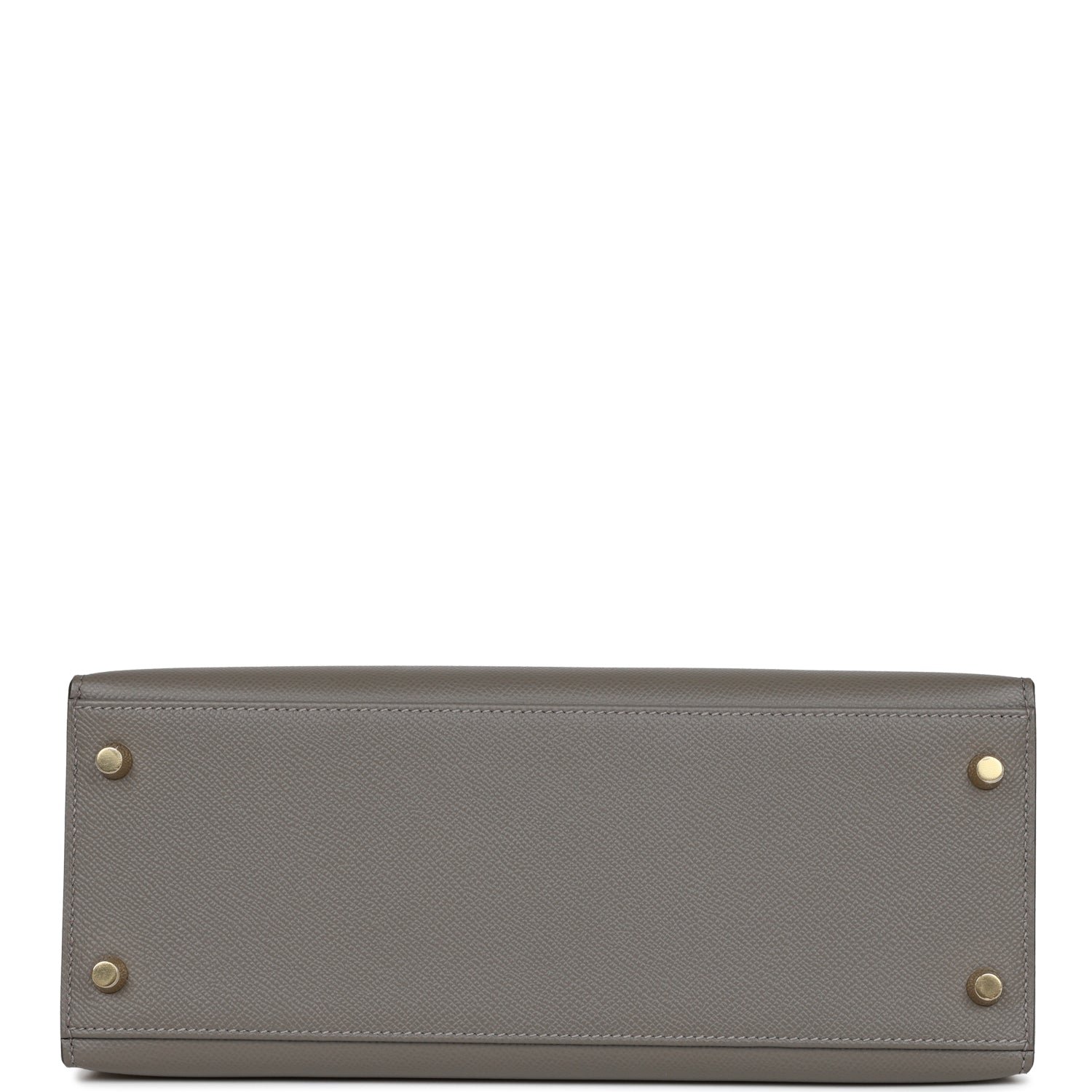 This Kelly, in the Sellierstyle, is inGris Meyer epsom leather withgold hardware and hastonalstitching, front flap, two straps with center toggle closure, clochette with lock and two keys a single rolled handle and removable shoulder strap.