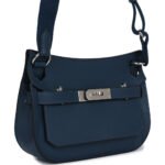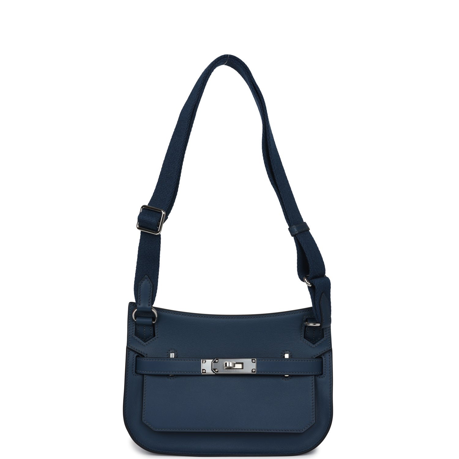 ThisMini Jypsiere bag is of Bleu De Prusse swift leather with palladium hardware, tonal stitching, single flap, two pull straps, turnlock closure, and a flat wool shoulder strap.