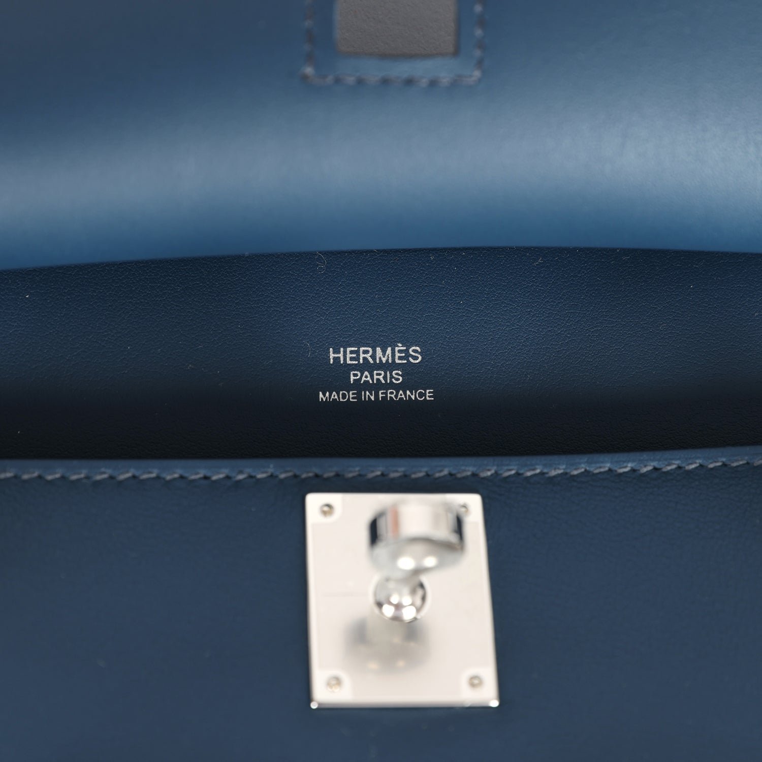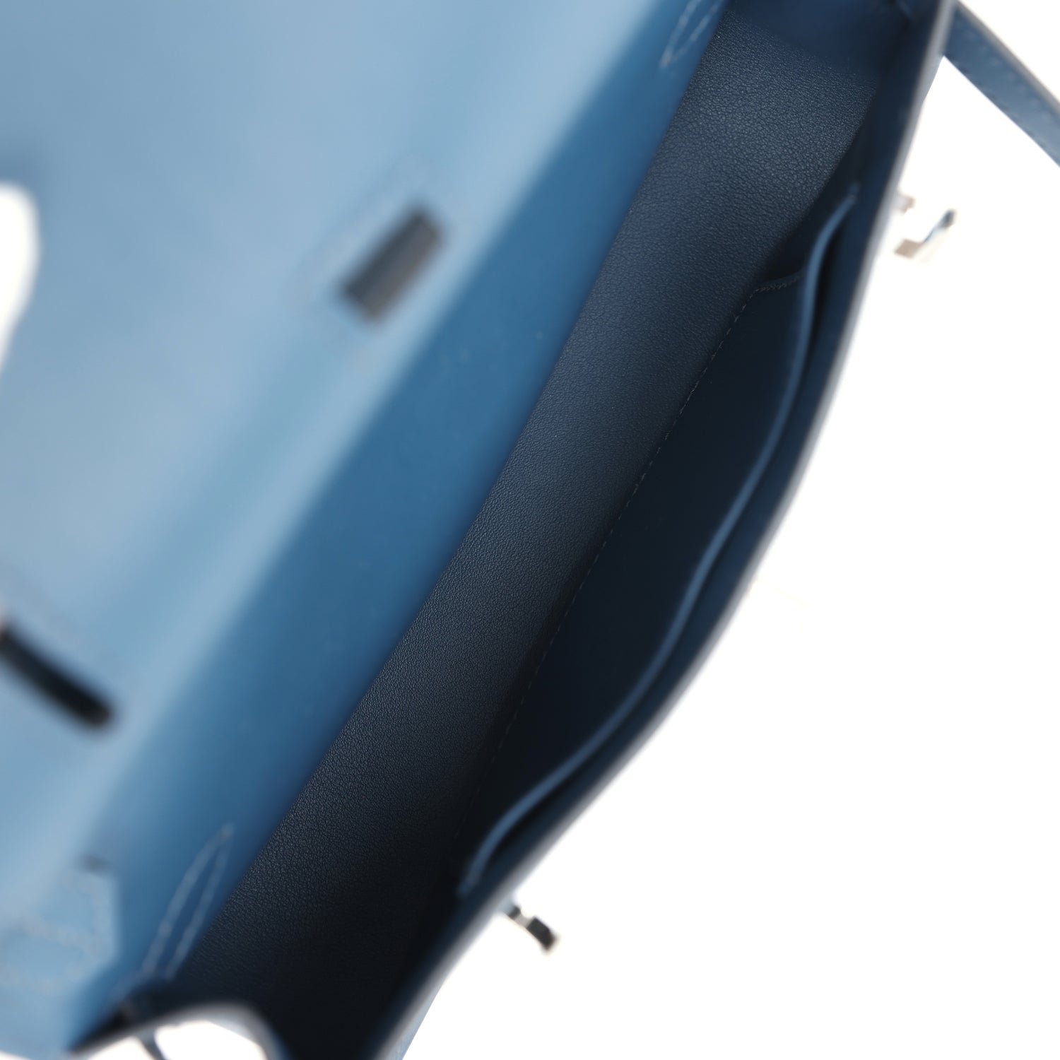The interior is lined with Bleu De Prusse lambskin and has one open pocket on the front wall.
