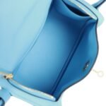This Mini Lindy is inCeleste swift leather withgold hardware and has tonal stitching, double zipper pulls, front Hermès twist lock, single pocket on each side, two rolled top handles linked by a flat shoulder strap.