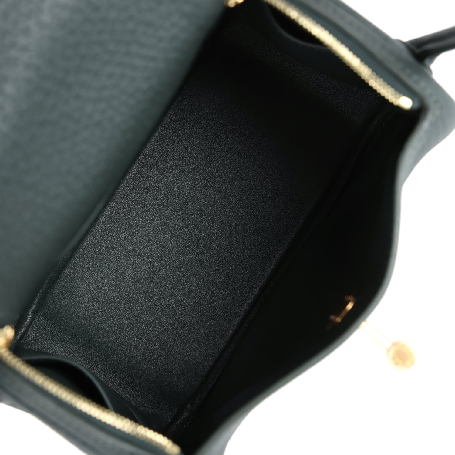 This Mini Lindy is in Vert Fonce taurillion clemence leather with gold hardware and has tonal stitching, double zipper pulls, front Hermès twist lock, single pocket on each side, two rolled top handles linked by a flat shoulder strap.