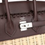 This rare PicnicBirkin Bag is inRouge Sellier swiftleather and Osier wicker with palladium plated hardware and hastonal stitching, front flap, two straps with toggle closure and doubletop handles.