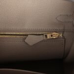 This Birkin is inEtoupe andEtain togo leather with brushed gold hardware and hascontrast and tonal stitching,front flap, two straps withcentertoggle closure, clochette with lock and two keys, and double rolled handles.