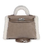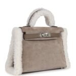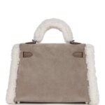 Thisrare Teddy Kelly is in Gris Caillou and Ecru Grizzly merino sheepskin and Etoupe swift leather with palladium hardware and has tonal stitching, a front toggle closure, a single rolled handle and an optional removable shoulder strap.