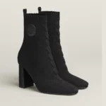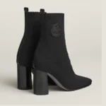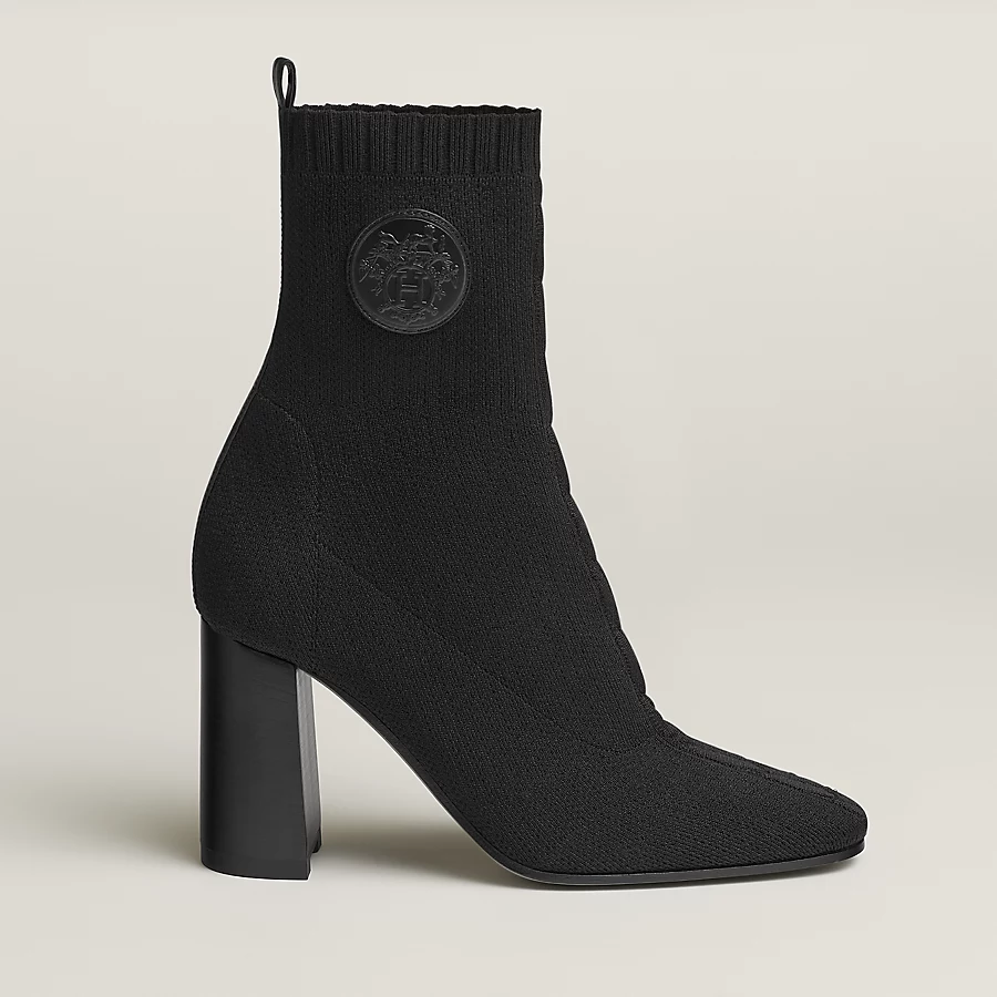 Ankle boot in knit and calfskin with ‘Clic! C’est Noue’ motif, Ex-Libris detail in calfskin and heel with horseshoe detail.