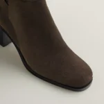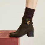High heel ankle boot in suede calfskin featuring the iconic aged golden Glenan buckle.