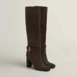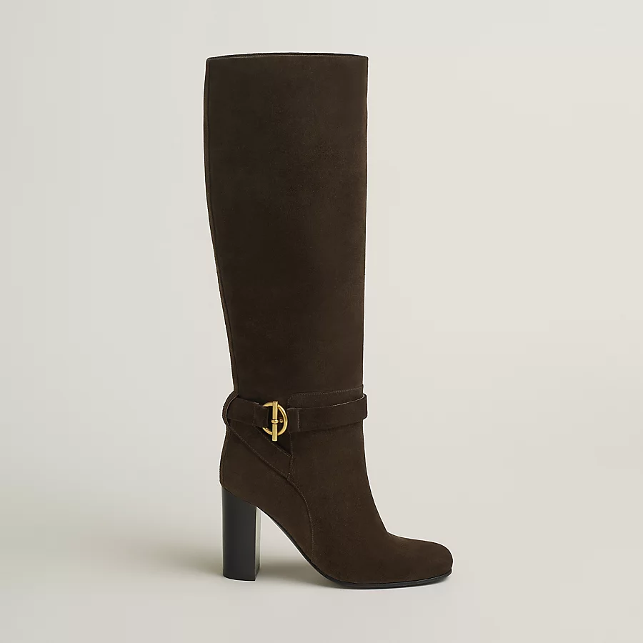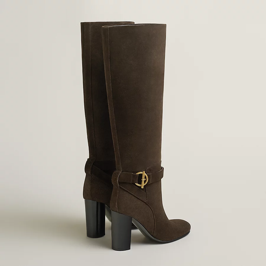High heel boot in suede calfskin featuring the iconic aged golden Glenan buckle.