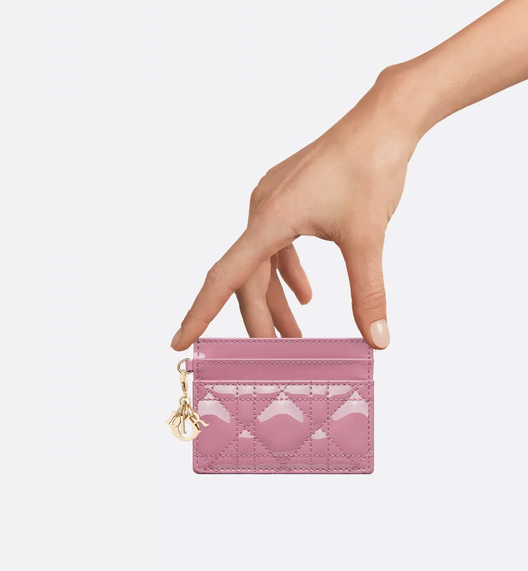 The Lady Dior Freesia card holder presents an elegant and practical style. Crafted in hydrangea pink patent calfskin with Cannage stitching, it is embellished with detachable D.I.O.R. charms. Featuring five card slots, the refined accessory will easily slip into any pocket or bag and can be paired with other Lady Dior creations.