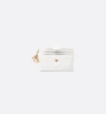 The Lady Dior Jasmine card holder pays tribute to the Dior leather artisans’ savoir-faire with its timeless Cannage topstitching. Crafted in latte patent calfskin, the style is compact and functional and can accommodate the daily essentials. Embellished with detachable D.I.O.R. charms and a snap flap closure, the gusset card holder can be coordinated with other Lady Dior creations.