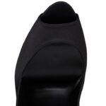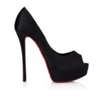 An iconic model, the Lady Peep seduces with its sculptural audacity. In black crepe satin, it is mounted on a platform and 150mm stiletto embellished with strass. Its scooped lines reveal with finesse a vertiginous arch. Each step attests to the savoir-faire of the Louboutin House while echoing the elegance of the film industry.