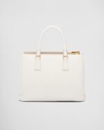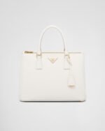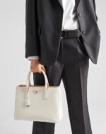 Production of the Prada Galleria bag, composed of 83 pieces, is an authentic fusion between industrial precision and the refined accuracy of craftsmanship that can only be performed by hand. The design is clean and elegant yet innately pragmatic, an aesthetic language blending form and function that combines history and modernity. Originating the definition of “timeless”, the Galleria bag has become a hallmark of Prada’s identity in the twenty-first century. The accessory, presented in the large version, is made of iconic Saffiano, a calf leather patented by Mario Prada that is resistant to scratches and water and defined by its crosshatch texture.