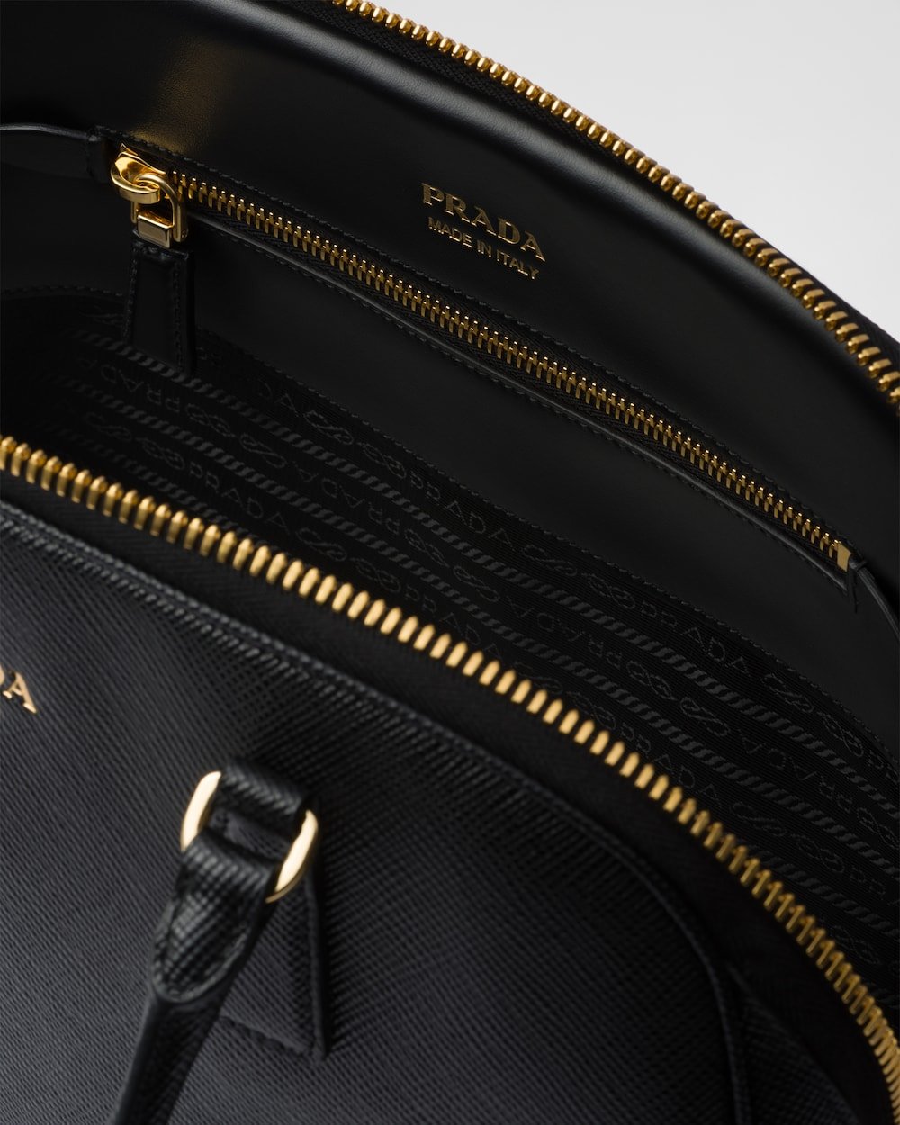 This bag with an elegant and sophisticated design and simple yet refined details emphasizes the distinctive crosshatch texture of Saffiano leather with a waxed finish. Brighten by the metal hardware, the accessory has a spacious interior with pockets and convenient leather handles. The lettering logo embossed on the front completes the versatile and timeless design, an expression of exceptional artisanal know-how.
