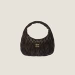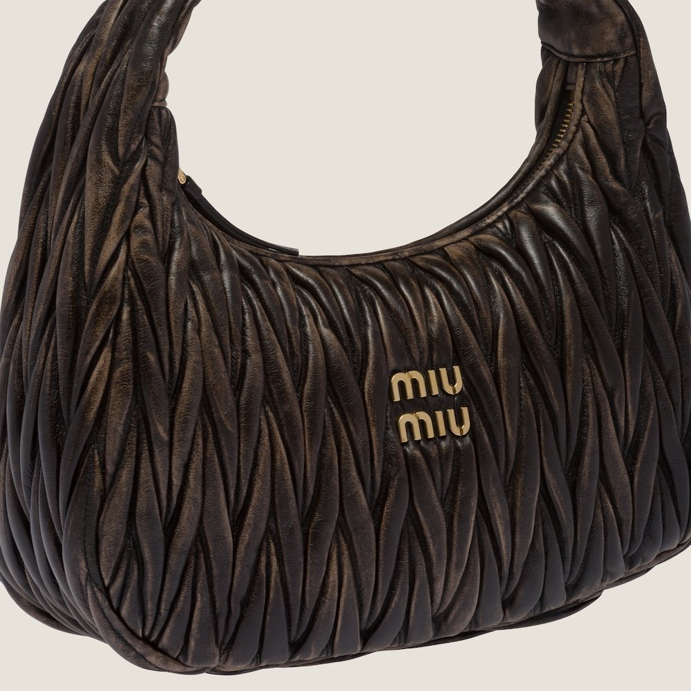 The Wander bag is reinterpreted season after season, becoming an iconic accessory of Miu Miu collections. Made with a unique technique that removes some of the color and is waxed at the end for a vintage effect, the bag is characterized by the sophisticated three-dimensional effect created by the fine workmanship. The hobo silhouette, a blend of retro inspirations and contemporary elegance, becomes a new expression of modern femininity.