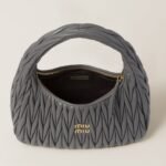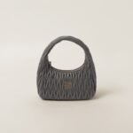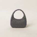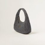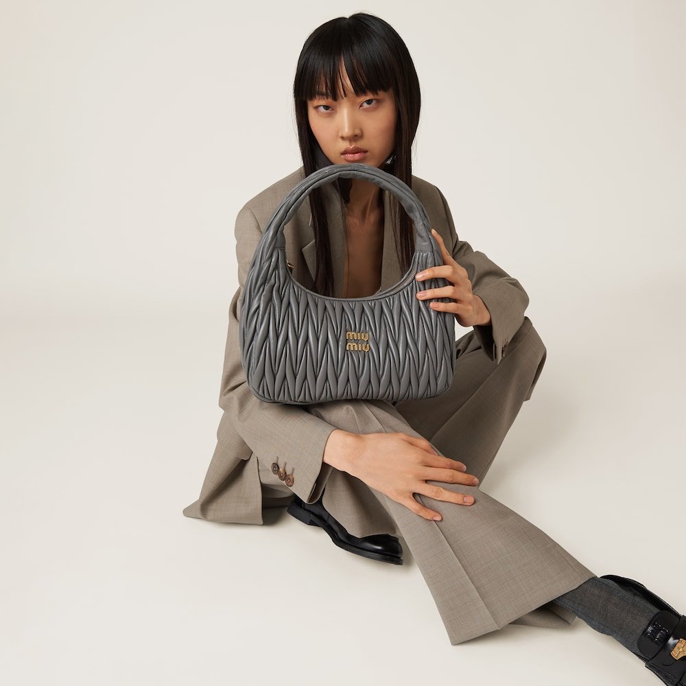 The Wander bag, reinterpreted season after season, has become an iconic accessory of Miu Miu collections. $ Made in matelassé nappa leather, the bag is characterized by the sophisticated, three-dimensional created by the fine workmanship. The hobo shape, blending retro inspirations and contemporary elegance, becomes a new synonym of modern femininity.