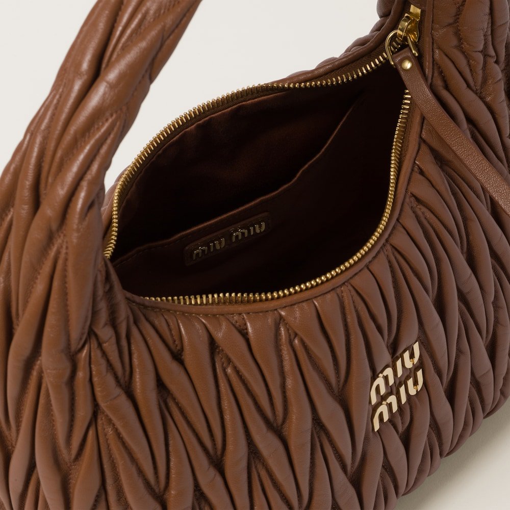 The Wander bag, reinterpreted season after season, has become an iconic accessory of Miu Miu collections. $ Made in matelassé nappa leather, the bag is characterized by the sophisticated, three-dimensional created by the fine workmanship. The hobo shape, blending retro inspirations and contemporary elegance, becomes a new synonym of modern femininity.