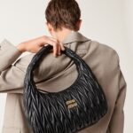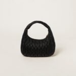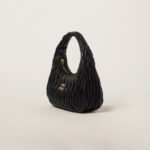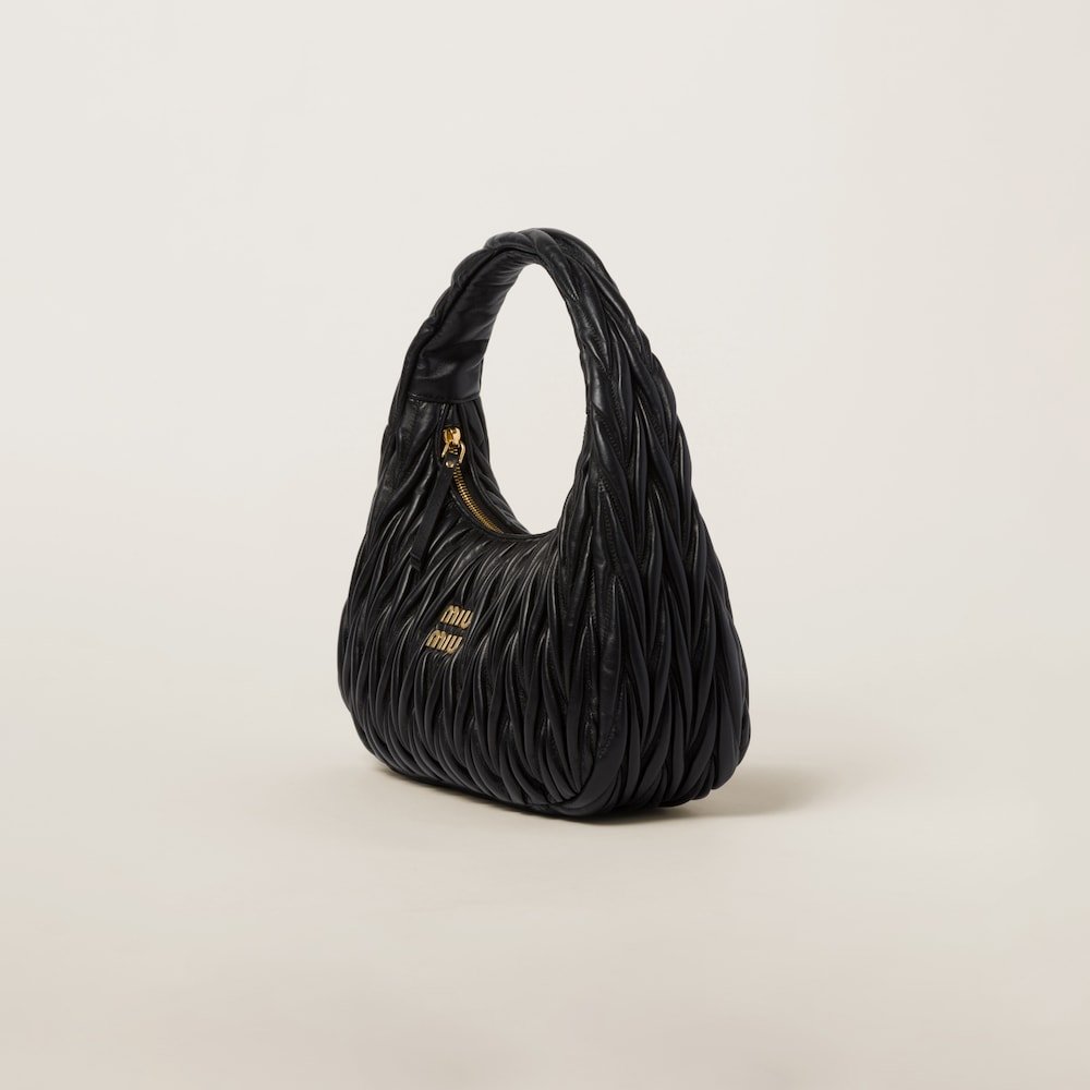 The Wander bag, reinterpreted season after season, has become an iconic accessory of Miu Miu collections. $ Made in matelassé nappa leather, the bag is characterized by the sophisticated, three-dimensional created by the fine workmanship. The hobo shape, blending retro inspirations and contemporary elegance, becomes a new synonym of modern femininity.