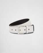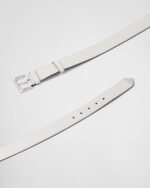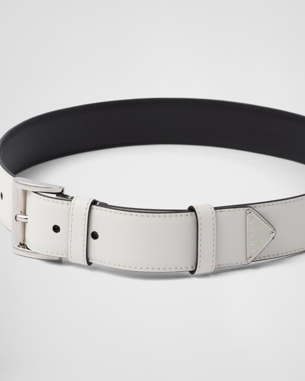 The tip of this leather belt features an iconic, enameled-metal triangle logo, which appeared for the first time on trunks designed by Mario Prada in 1913.