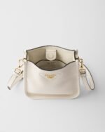 This versatile leather bag boasts a sleek and functional design. The shoulder strap adds a sporty element to the accessory, elevated by the metal logo lettering that stands out on the simple yet distinctive geometry of the iconic triangle.