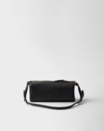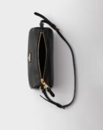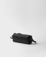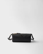 Zipper closure–Enameled metal triangle logo–Adjustable leather handle–Logo-print nylon lining with zipper pocket