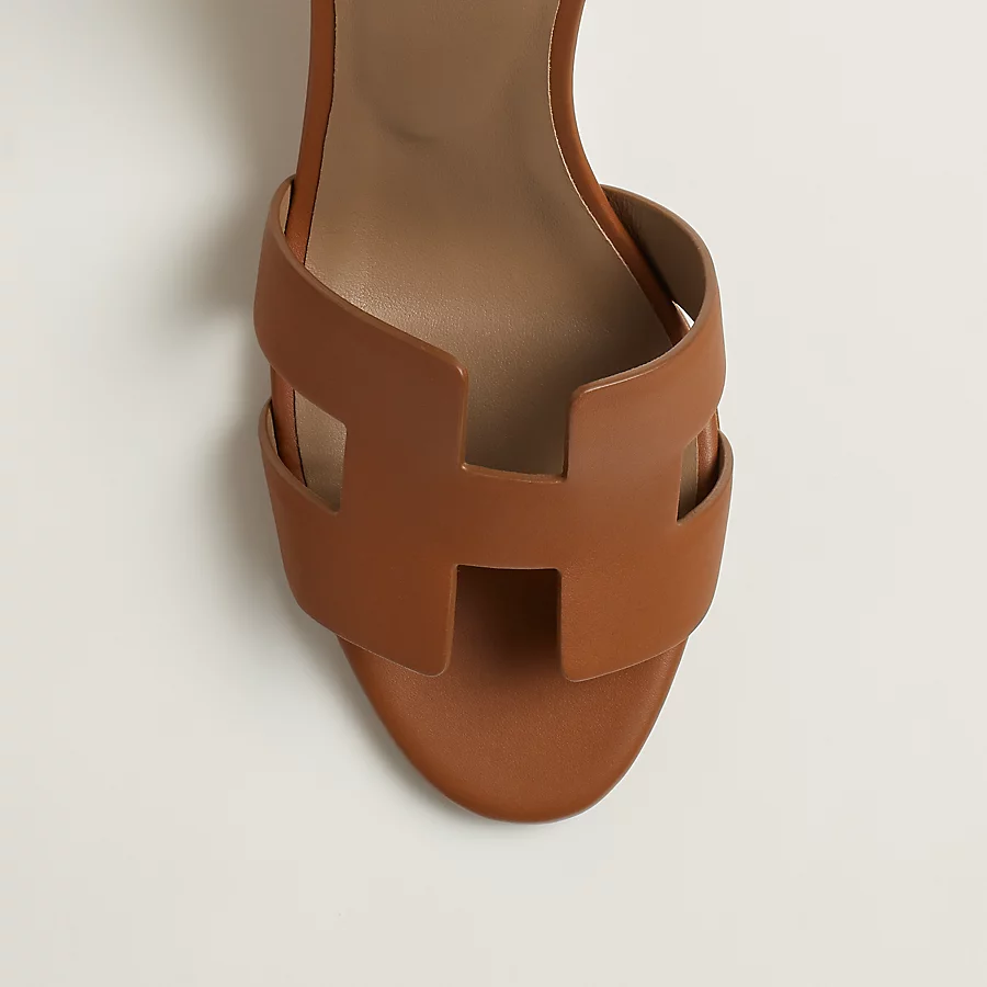 Sandal in calfskin with iconic ‘H’ cut-out, wedge heel, and thin ankle strap.