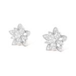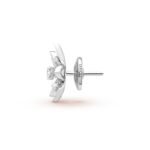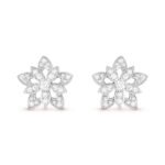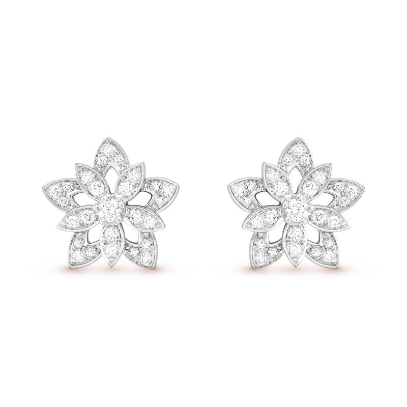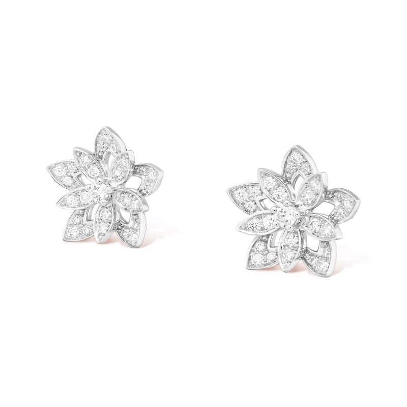 Lotus openwork earrings, mini model, rhodium plated 18K white gold, round diamonds; diamond quality DEF, IF to VVS.
