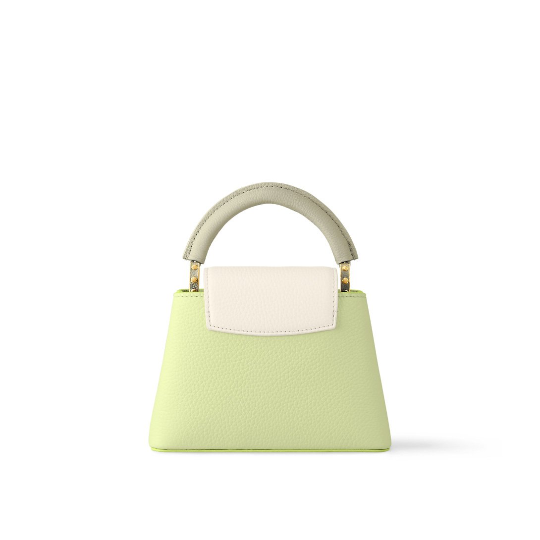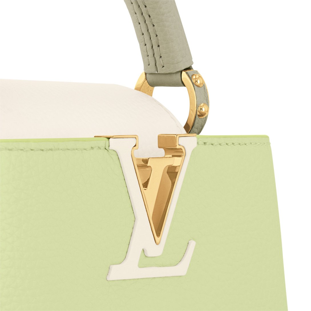 A bright color block treatment brings a joyous feel to this Capucines Mini handbag, crafted from Taurillon leather in shades of green and white. The top handle and flap in contrasted colors add a fresh feel to the classic shape. The removable braided chain strap adjusts for shoulder and cross-body carry.
