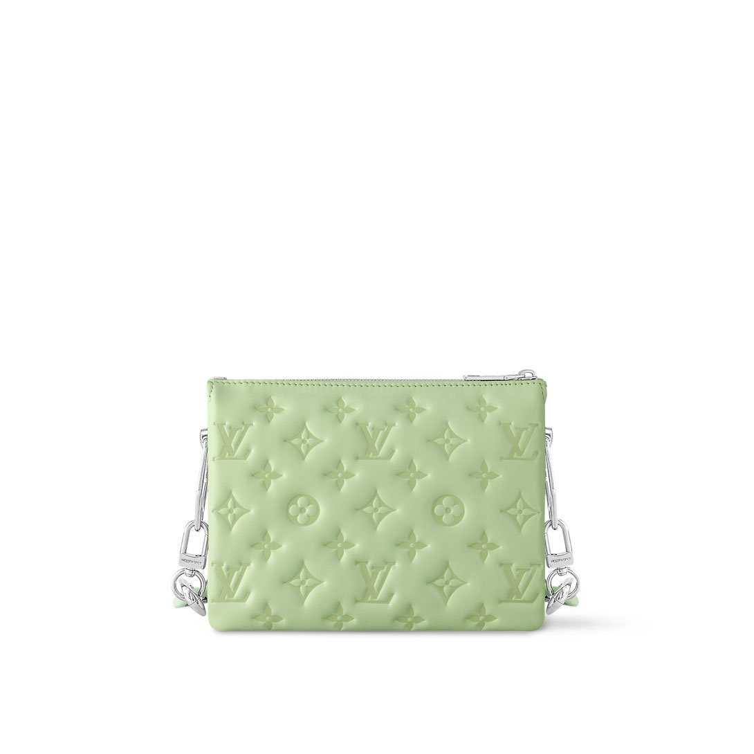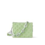 Fashioned from padded lambskin with Monogram embossing, the Coussin BB handbag features a chunky chain with Plexiglass links for a colorful touch. The Plexiglas links, in the same color as the bag, alternate with gold-color metallic links engraved with LVs and Monogram Flowers. A detachable leather strap gives additional carry options.