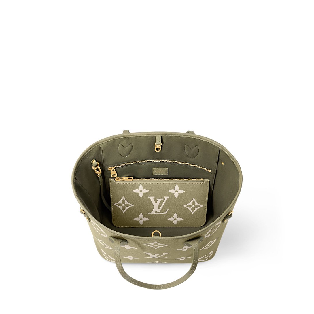 This Neverfull MM handbag is crafted from grained Monogram Empreinte cowhide. Printed with the Giant Monogram, the Neverfull bag is roomy and features side ties that can be tightened for a sleek appeal or relaxed for a casual look. Inside the bag is a removable pouch that attaches to the bag with a leather cord.