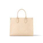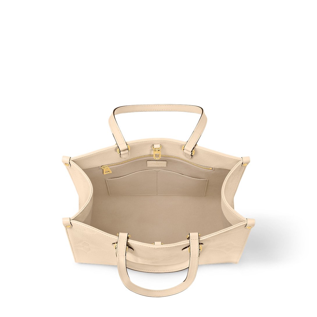 The OnTheGo MM tote now comes in cream-color Monogram Empreinte leather with a matching microfiber lining. The Monogram embossed into the grained leather brings a subtle elegance to the bag’s boxy shape. The roomy interior can easily fit a laptop while rolled-leather top handles and two long shoulder straps give carrying options.