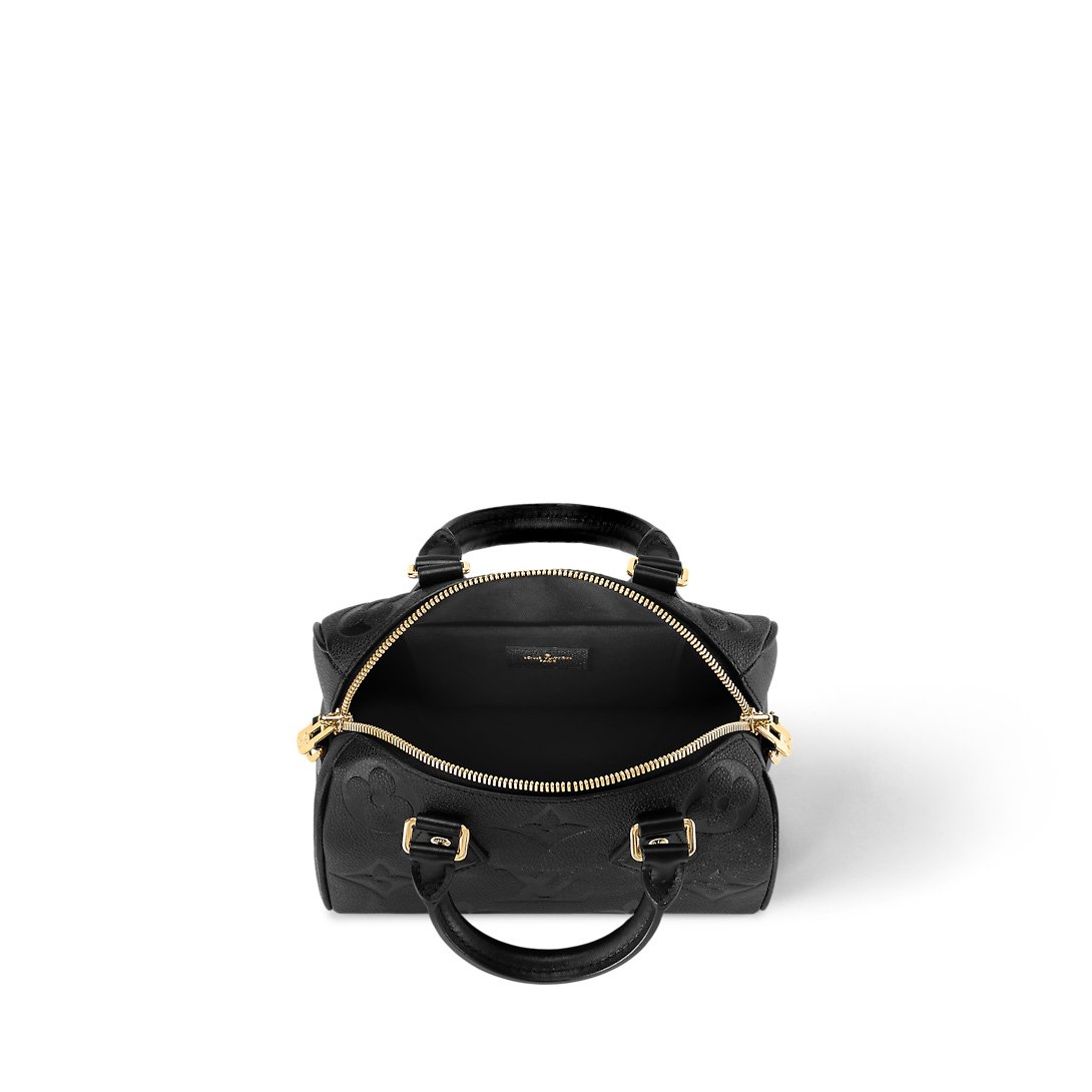 The Speedy Bandoulière 20 is an on-trend compact handbag, just the right size to carry daily essentials. It’s made from smooth grained Monogram Empreinte leather, embossed with an Oversized Monogram pattern. The hardware and padlock are a golden color. It has a delicate chain strap – removeable and adjustable – in addition to two Toron handles.