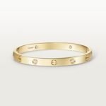 Product Description: LOVE bracelet Yellow gold (750/1000) Set with 4 brilliant-cut diamonds totaling 0.42 carats Width: 6.1 mm Oval bracelet composed of two rigid arcs which is worn on the wrist and removed using a specific screwdriver The closure is designed with two functional screws placed on either side of the bracelet: you will need help to open or close it To determine the size of your LOVE bracelet measure your wrist adding one centimeter to your size for a tighter fit or two centimeters for a looser fit