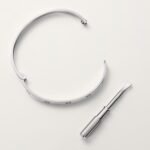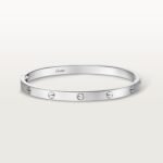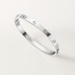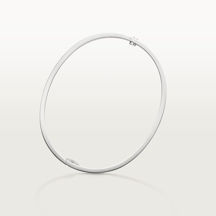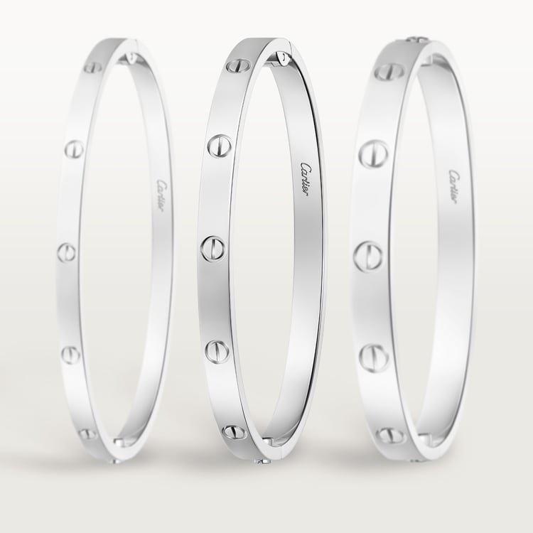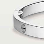 LOVE bracelet, medium model, 18K white gold (750/1000), closure system with functional screw and hinge. Comes with a screwdriver. Width 4.8 mm. Created in New York in 1969, the LOVE bracelet is a jewelry design icon: a close fitting, oval bracelet composed of two rigid arcs, which is worn on the wrist and removed using a special screwdriver.
