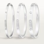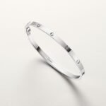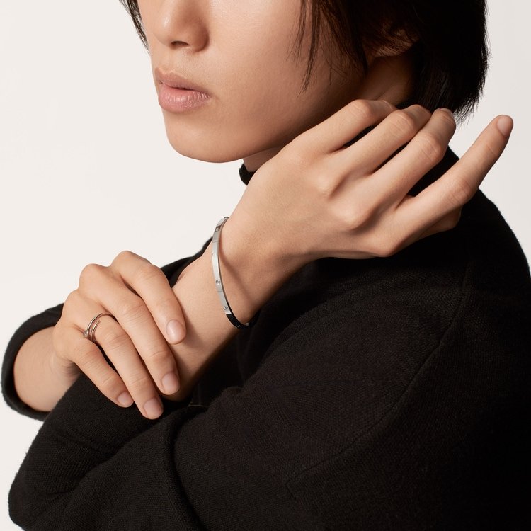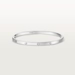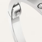 LOVE bracelet, small model, 18K white gold (750/1000), fastening system with functional screw and hinge. Comes with a screwdriver. Width 3.65 mm. Created in New York in 1969, the LOVE bracelet is a jewelry design icon: a close fitting, oval bracelet composed of two rigid arcs, which is worn on the wrist and removed using a special screwdriver. Cartier continues the story of the original LOVE bracelet with a slimmer version featuring a hinge. Same design, same story: a timeless ?C yet slightly slimmer ?C creation which is fastened using a screwdriver. On this model, the closing system consists of a functional screw on one side of the bracelet and a hinge on the other, enabling it to be put on and taken off by itself with the help of a screwdriver. To determine the size of your LOVE bracelet, measure your wrist, adding one centimeter to your size for a tighter fit, or two centimeters for a looser fit.