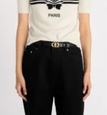 New for Summer 2025, the Lucky 30 Montaigne Star belt showcases one of Mr. Dior’s cherished symbols. Crafted in black smooth calfskin, the design features a shiny gold-finish metal CD buckle enhanced by the House’s lucky star with a white resin pearl at its center. The belt will add an elegant and timeless touch to a Bar Jacket, a dress or jeans.