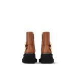 The LV Beaubourg ankle boot in smooth calf leather is notable for its belt detail inspired by the Spring-Summer 2024 show. The belt is secured with Louis Vuitton-engraved studs and finished with an engraved plaque, both in gold-toned metal. This easy-to-wear style comes on a sturdy heel and a chunky yet lightweight micro outsole.