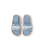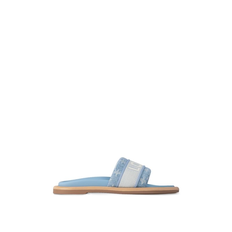 The LV Bliss comfort mule is a casual style distinguished by its wide front strap in faded Monogram denim, which is embellished with a Louis Vuitton ribbon. Natural leather edging around the outsole is a refined detail of this design, which also features a padded insole and a lightweight rubber outsole.